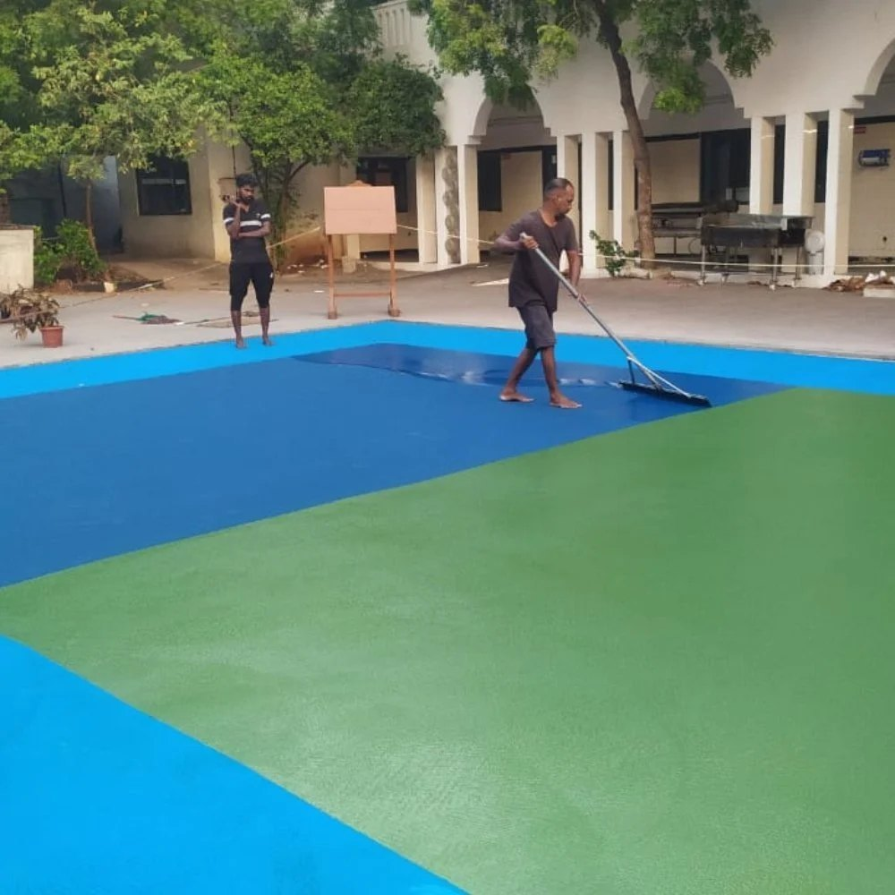 The first and most critical step is surface preparation. Acrylic flooring requires a strong, stable base—usually concrete or asphalt. The surface must be thoroughly cleaned to remove dust, oil, grease, loose particles, and any existing coatings. In Delhi, where dust accumulation is common, this step cannot be taken lightly. Any cracks, undulations, or damaged areas in the base are repaired using specialized compounds. Proper slope and drainage are also ensured, especially for outdoor applications, to prevent water stagnation during the monsoon season.
